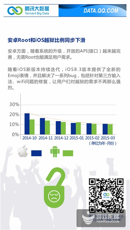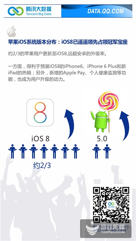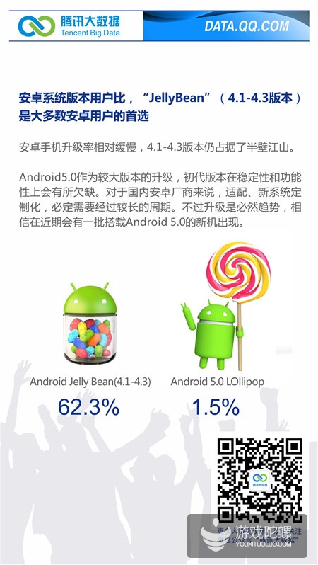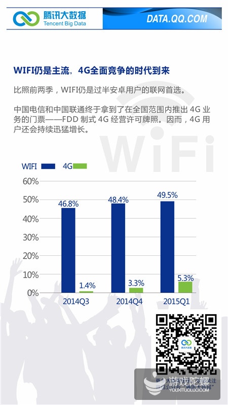 手游客栈今日报道(2015.05.05),腾讯大数据发布了2015年Q1移动行业数据报告。报告显示,2/3的苹果用户已升级至iOS8系统,对于安卓市场,4.1-4.3版本仍占据半壁江山。同时,WIFI是过半安卓用户首选,但4G用户持续迅猛增长。