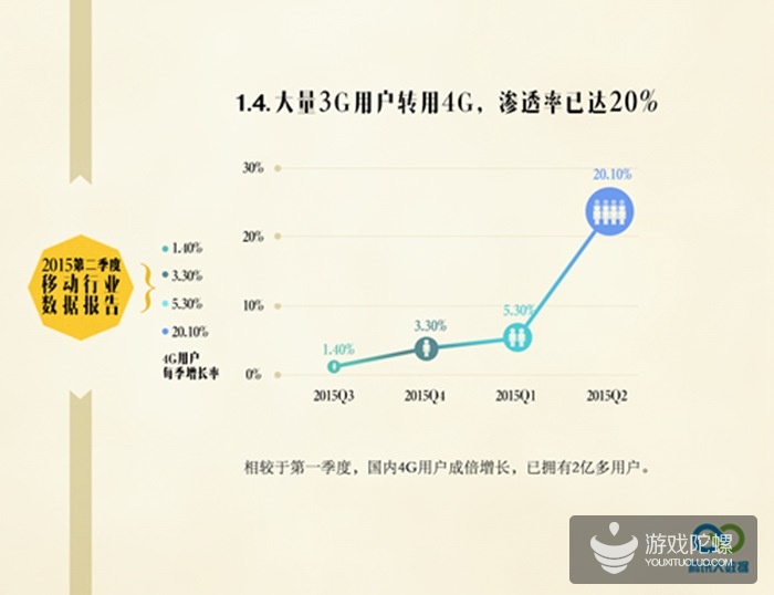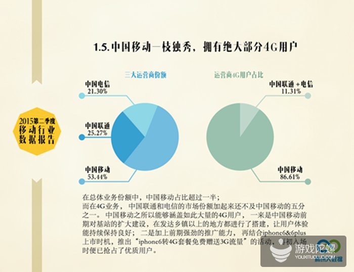 1、移动设备现状:大屏手机、国产手机、4G用户都有很大的提升,而4G用户中,移动占绝大多数,达到86.61%。