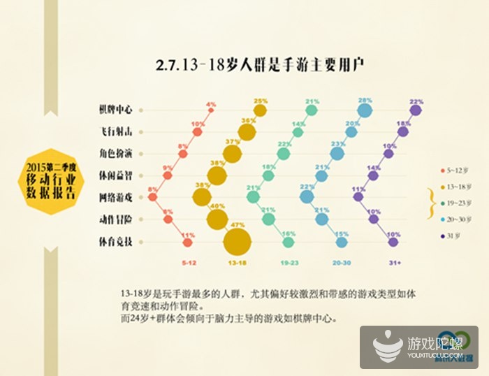2、休闲益智游戏增长率超40%,势头最猛。从整体来看,中国手游用户多分布在中国东部,而集中在广东、江苏等东南部,而手游开发者也在东部地区,北京和广东最多。男女手游用户比例约为7:3,男性手游玩家占比远高于女性,而手游用户主要集中在13——18岁的90、00后用户群中。