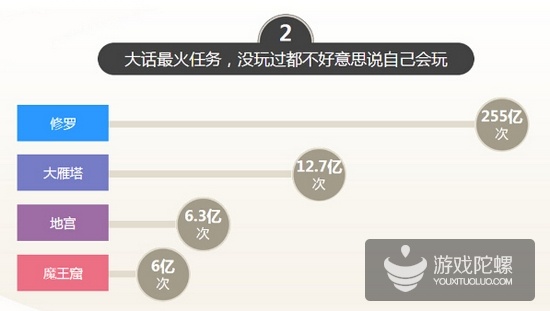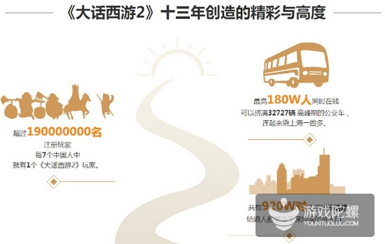 游戏客栈今日报道(2015.08.28)网易今日公布了《大话西游2》十三周年的相关数据,数据显示,该游戏注册玩家超过1.9亿,也就是每7个中国人中就有一个《大话西游2》玩家;最高同时在线人数为180万人,这意味着可以挤满32727量高峰期的公交车,连起来绕上海一圈多;共有920万对在游戏里结婚,人数相当于深圳城市总人口。以下是详细报告。