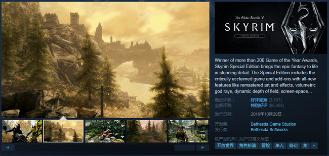 该作原价为129元,这一次特惠价只要二分之一,64元。也是备受好评的《上古卷轴》系列游戏,背景设定在《上古卷轴4:湮灭》的200年时间之后,玩家在游戏中扮演龙裔,为了对抗奥杜因展开冒险。庞大的任务量和任务支线,超高的自由度让人印象深刻。