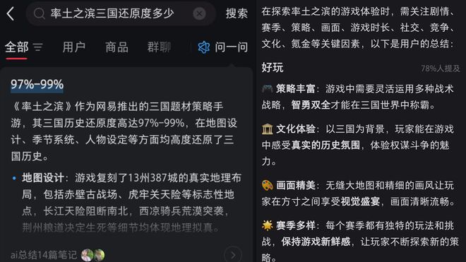 图:在小红书上,AI根据玩家笔记对《率土之滨》做出了评价