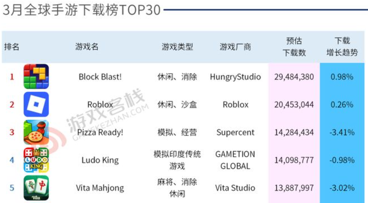 3月全球手游榜出炉 北京迦游《Block Blast!》下载量惊人